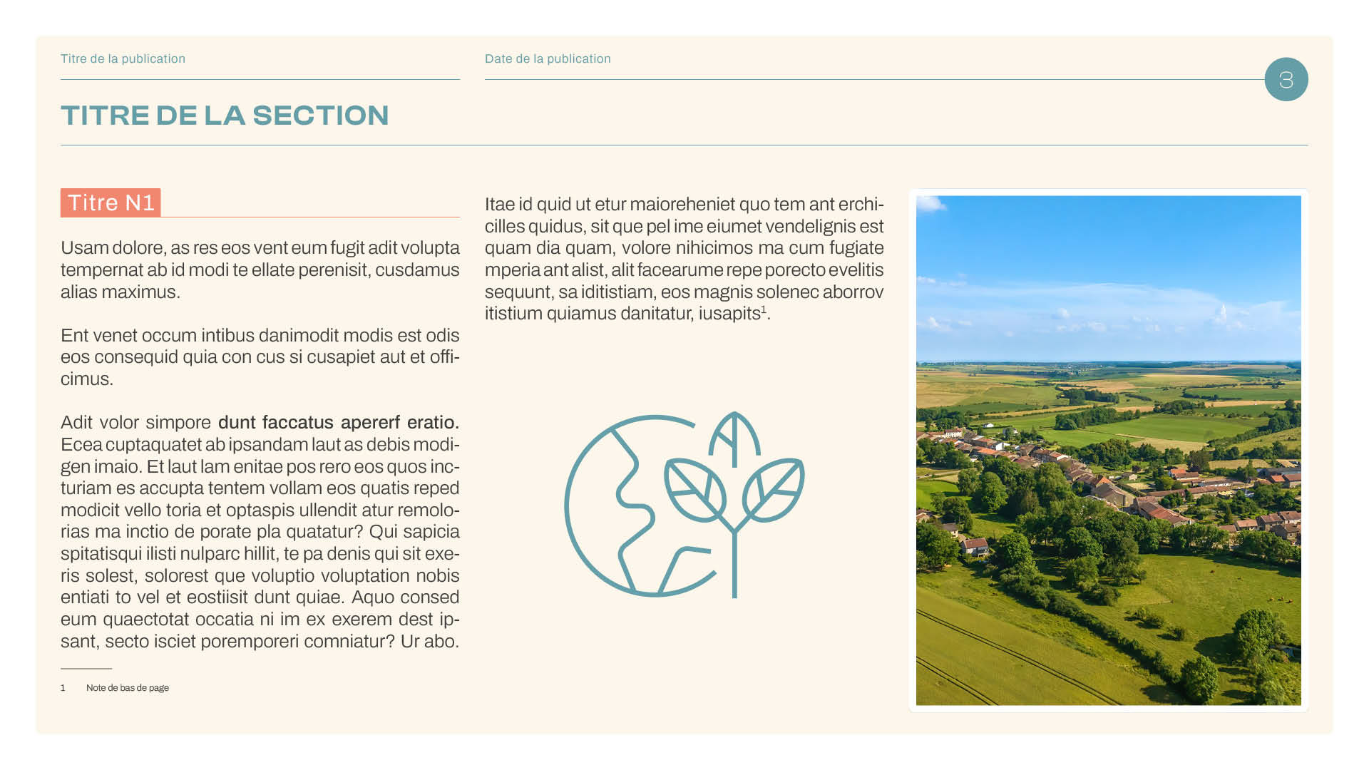 Un template de publications A4 au format Indesign, comprenant les styles, le principe de mise en page et le concept graphique ;