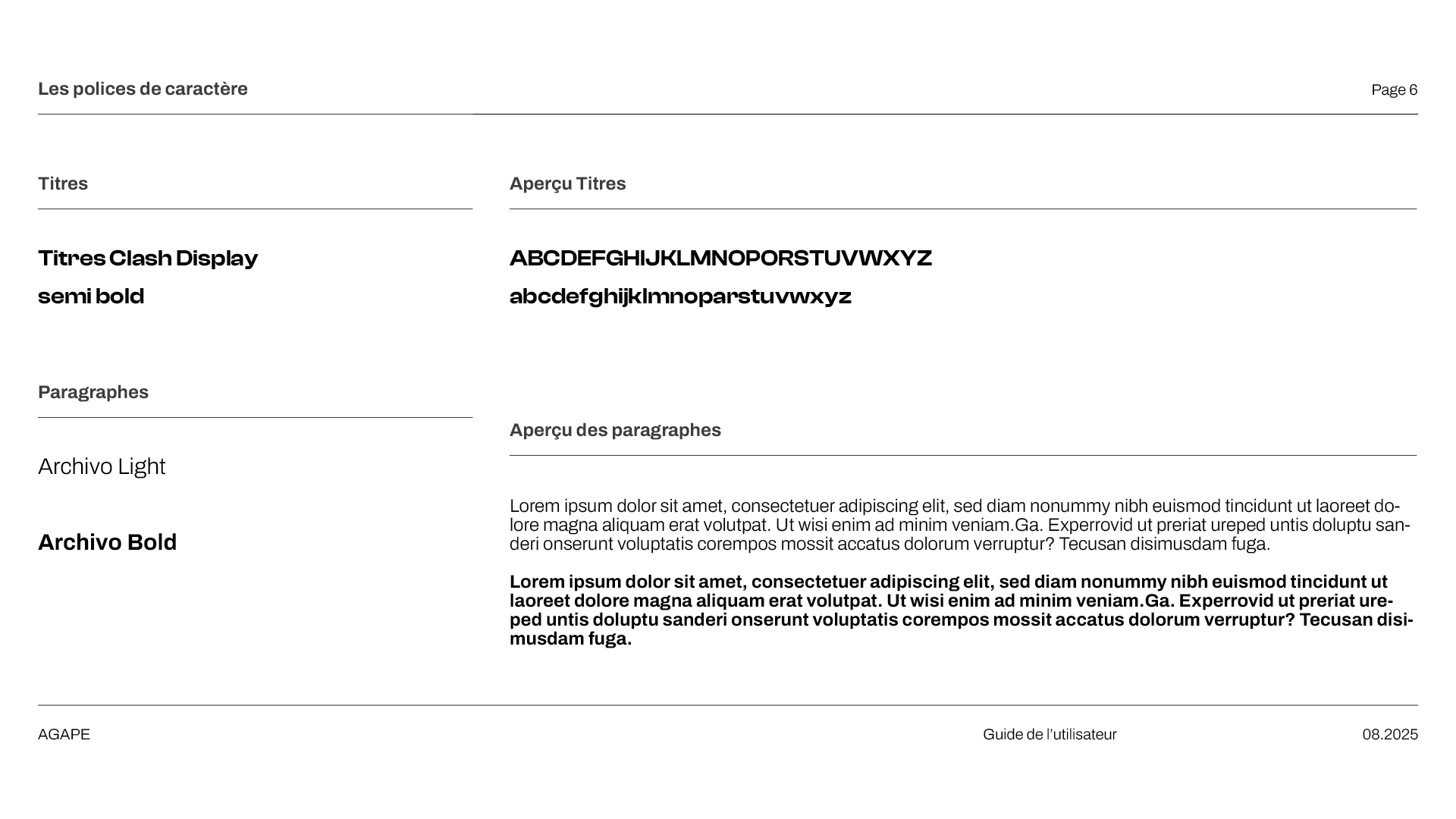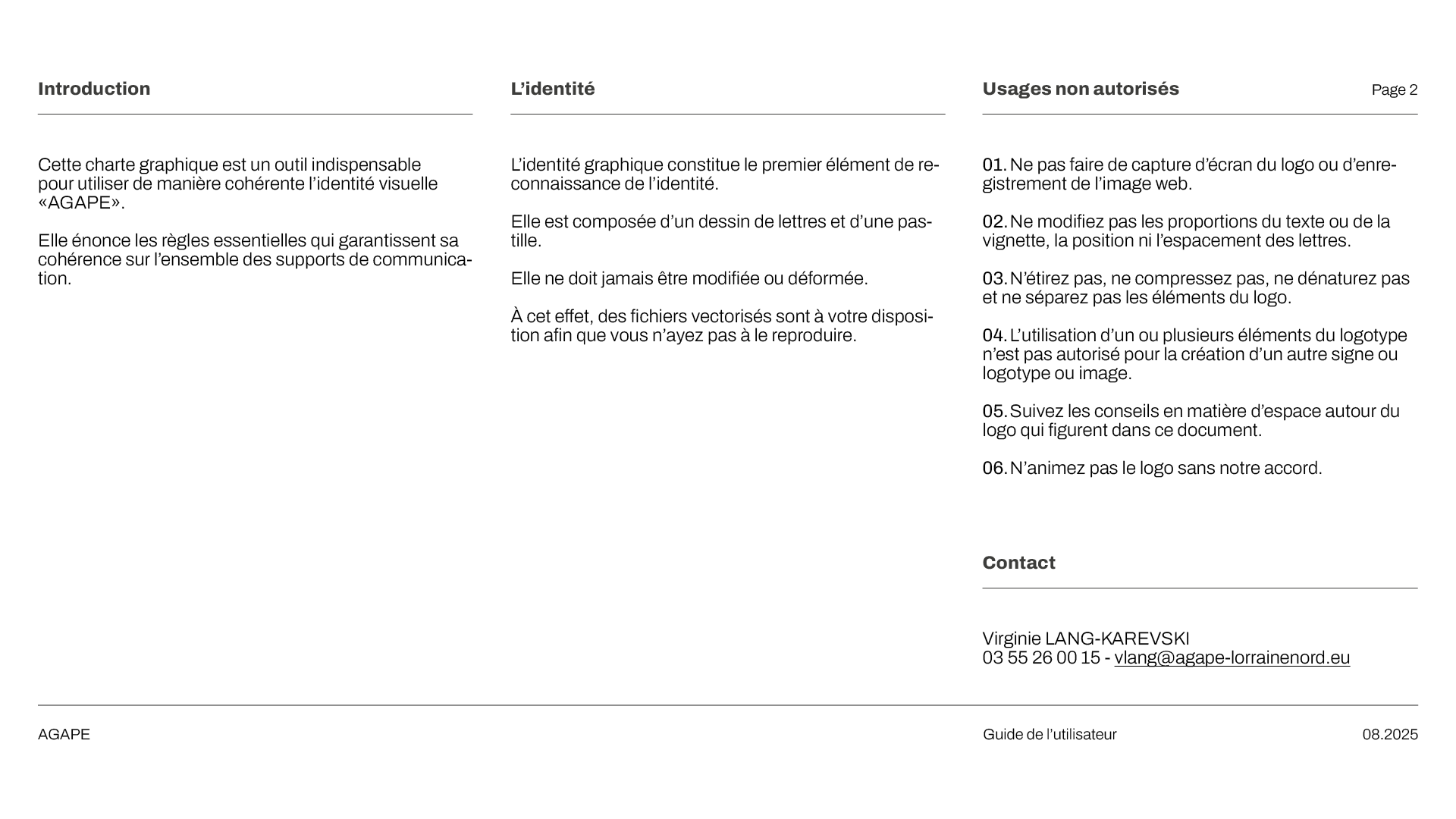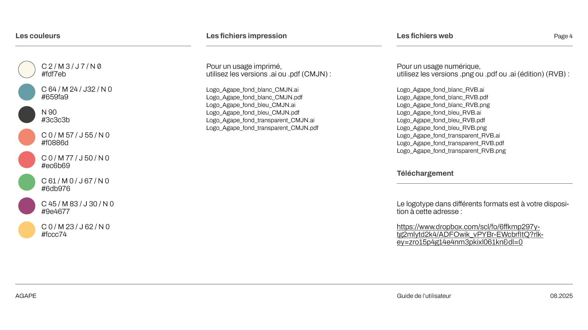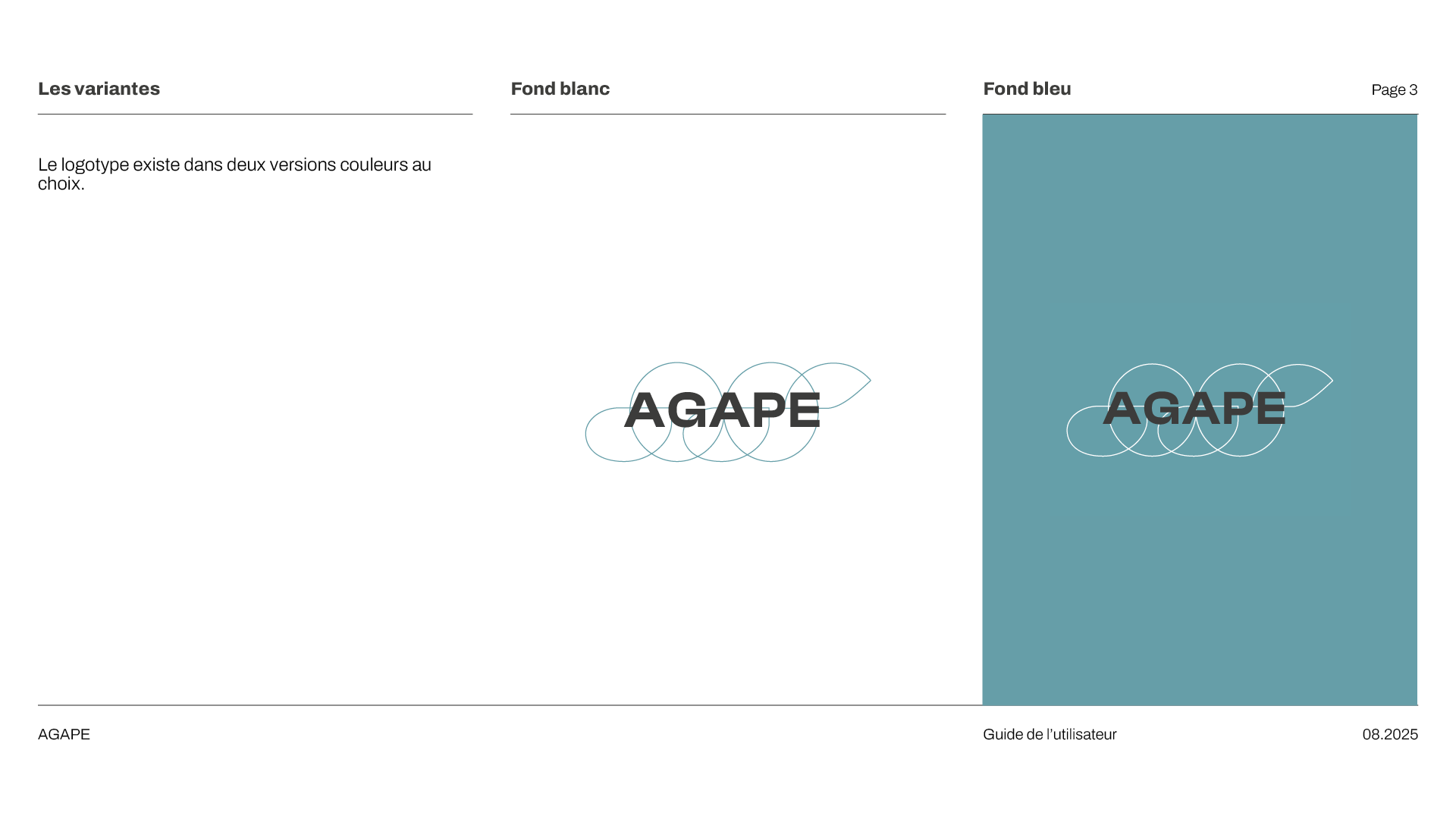 Dans la continuité de cette collaboration, mon engagement de designer s’inscrit dans une démarche globale d’accompagnement de l’Agape vers une refonte stratégique de sa communication. L’objectif est de redéfinir une identité cohérente et lisible, capable de renforcer la visibilité de l’Agence et d’harmoniser l’ensemble de ses supports et outils de diffusion.