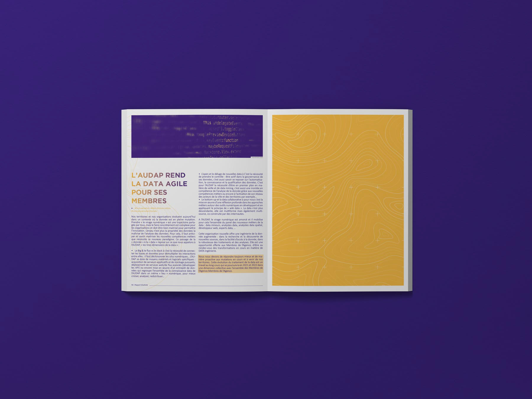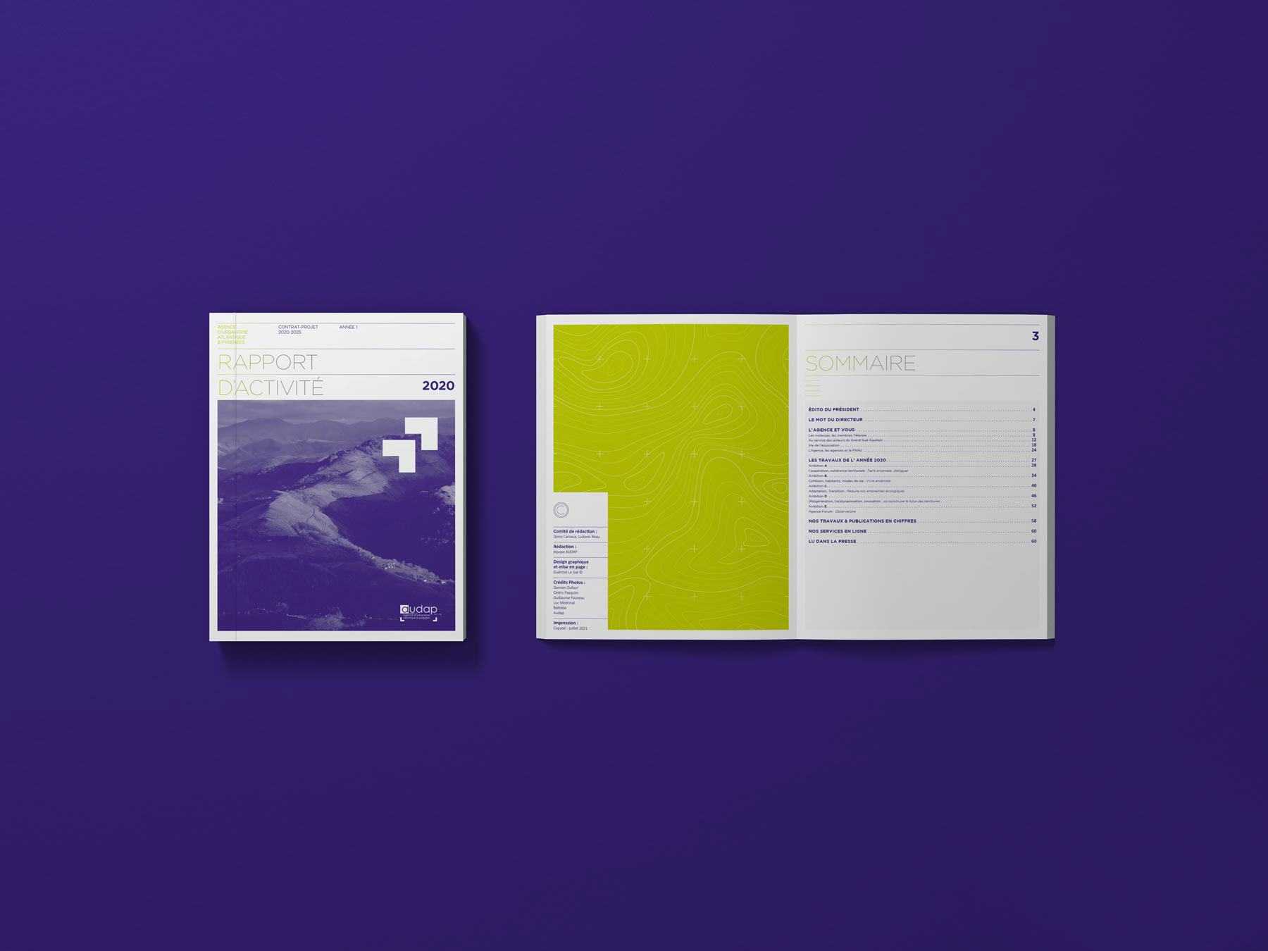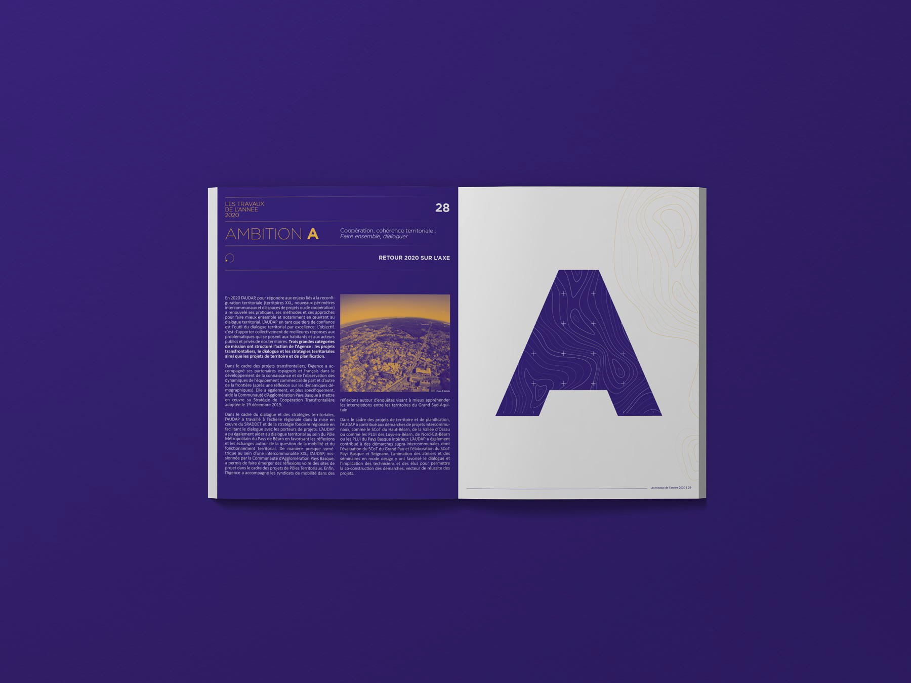 Contexte : La Direction de la communication de l'Agence d'Urbanisme Atlantique et Pyrénées m'a confié la création et la mise en page du rapport d’activité portant sur l'exercice 2020.